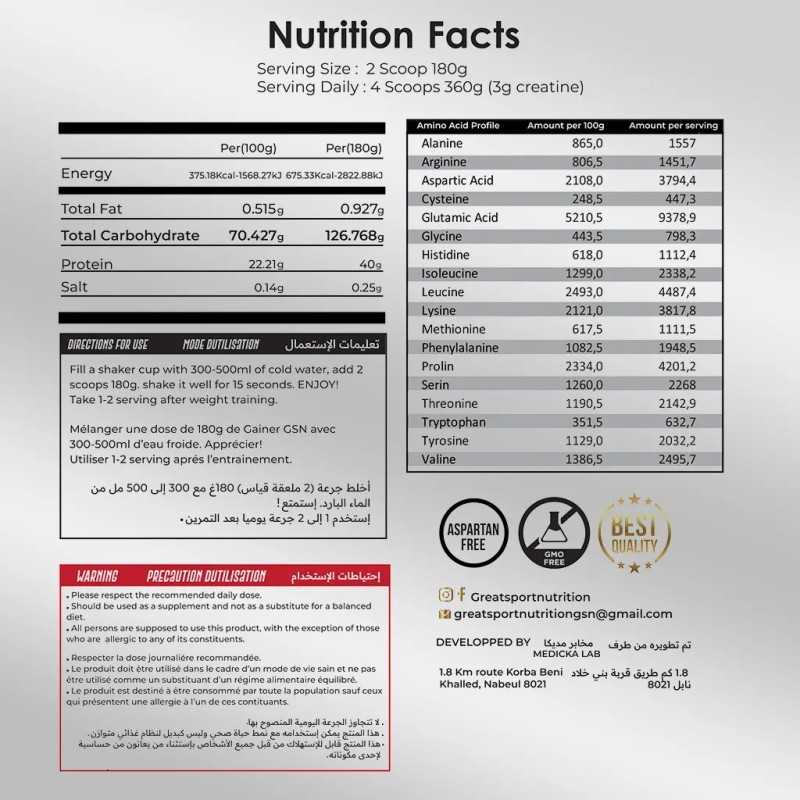 GSN (Great Sport Nutrition) offre des formules efficaces, fiables et testées. Le Big Mass Gainer est conçu pour répondre aux besoins des sportifs cherchant un produit performant pour prendre du poids rapidement sans compromis sur la qualité.