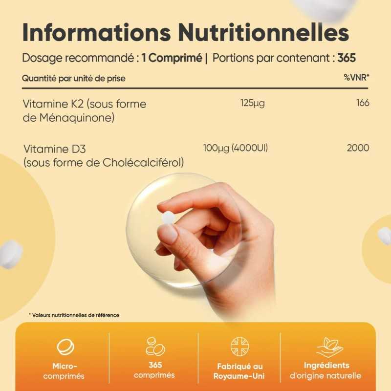La vitamine D3 contribue au maintien des os et du système immunitaire, tandis que la vitamine K2 aide à diriger le calcium vers les os, soutenant ainsi la santé cardiovasculaire.